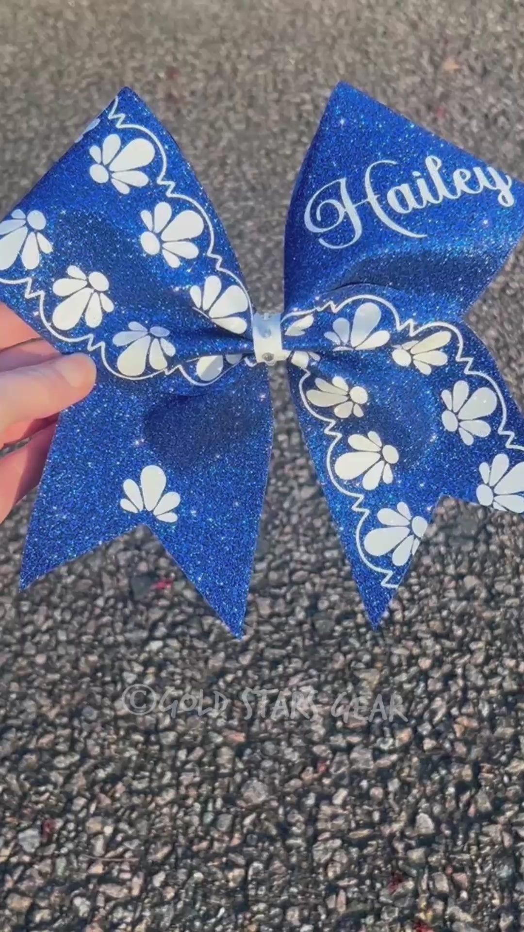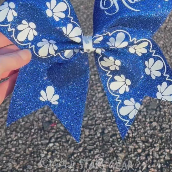 Full size glitter cheer bow shown in two colors: royal blue and white. Your choice of two colors. This bow design was inspired by Chinese and Dutch styles of pottery.